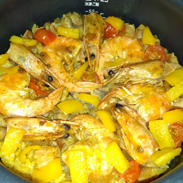 炊飯器でカレー風味のパエリアにしました。身がプリプリで、ご飯も海...